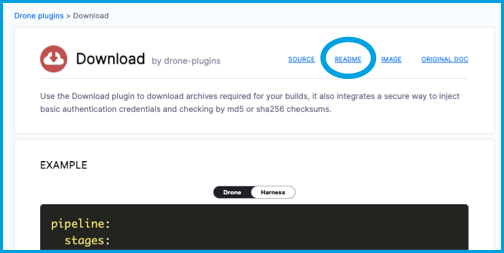 For detailed information about a plugin's settings, go to the plugin's page on the Drone Plugins Marketplace. In addition to the settings described on a plugin's Marketplace page, each plugin has a README where you can read about the plugin's settings in detail. The README can include additional or uncommon settings that aren't described on the Marketplace page or the Harness CI documentation. You can find README links at the top of each plugin's Marketplace page.