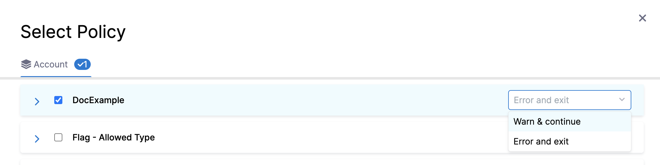 - Error and exit - You'll get an error and be exited without saving the Connector if the policy isn't met when the Connector is examined.