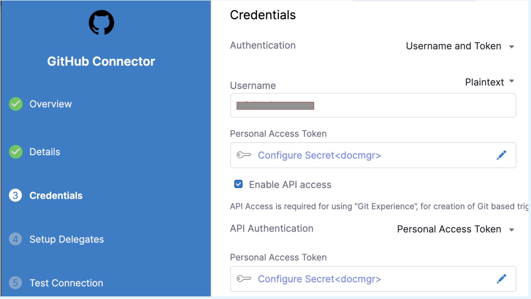 noteThe Git connector must use the Enable API access option and Username and Token authentication.